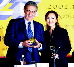 2002.11.27,於演唱會記者會上,二姐送了一座琉璃不倒翁給多明哥,表達對這位世紀音樂家的崇敬。